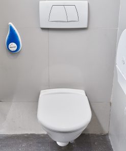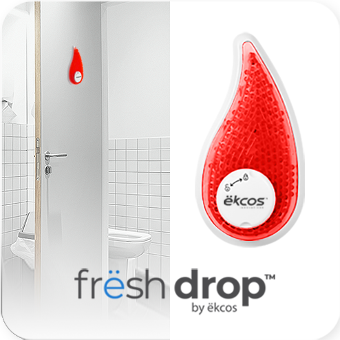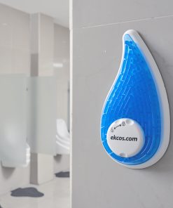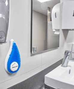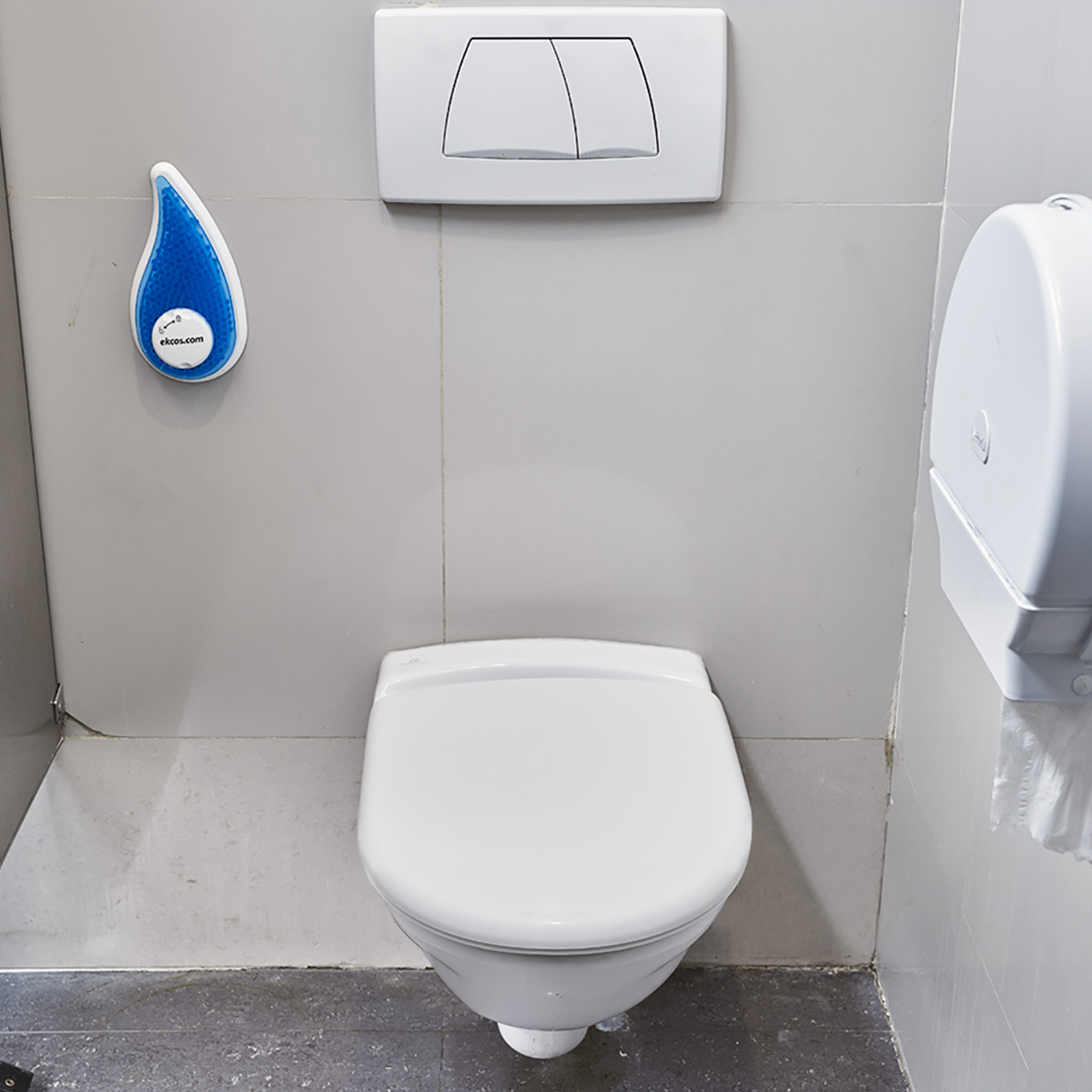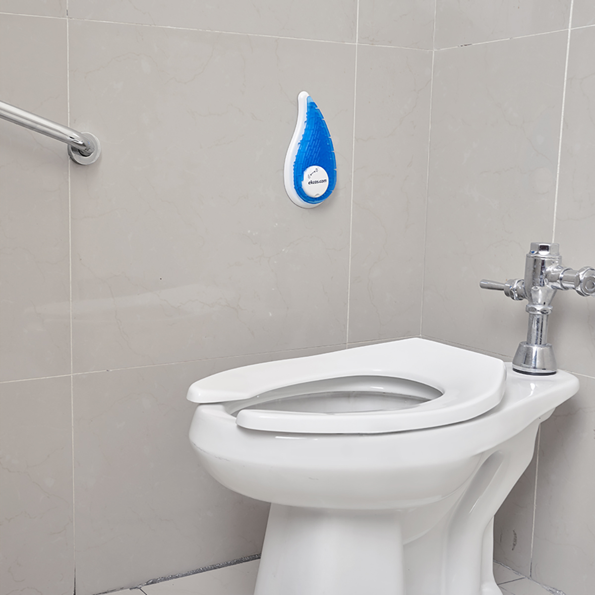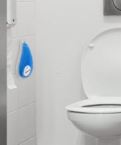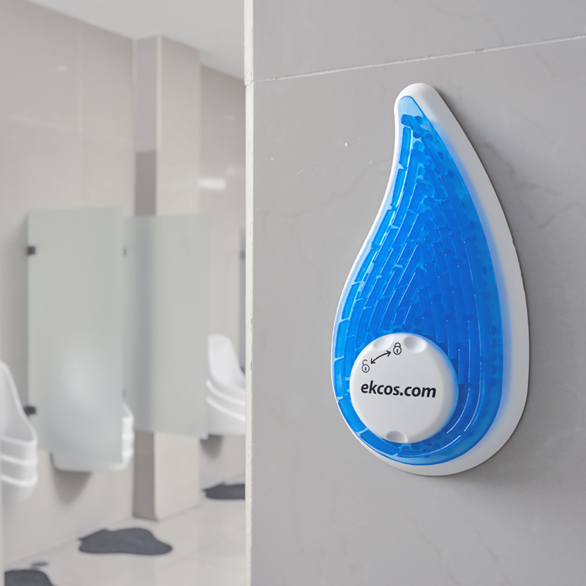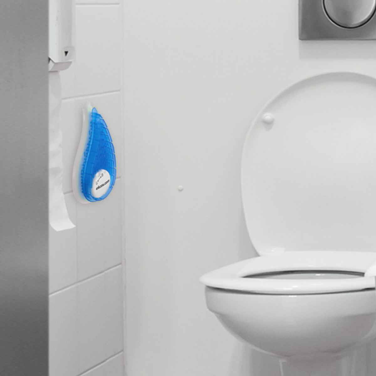 Aromatizante pasivo de diseño versátil, pensado para fijarse en superficies como puertas, muros o espejos dentro de cubículos sanitarios.